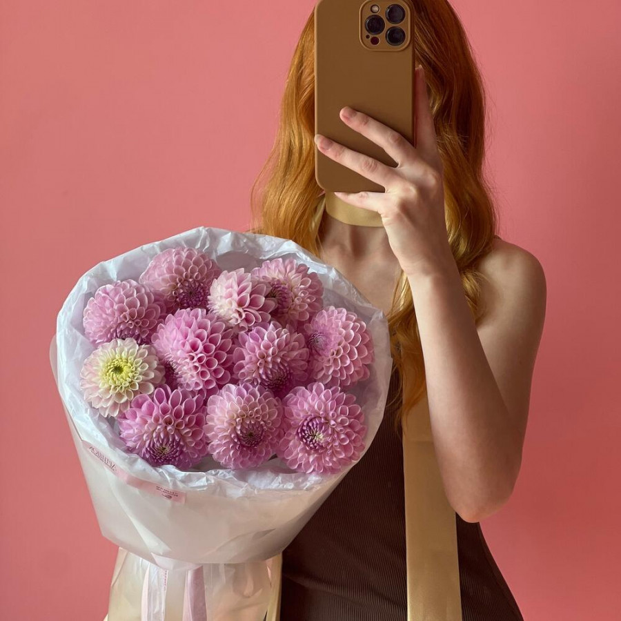 На фото букет из 11 розовых георгин. В составе: георгина 11 шт, дизайнерская упаковка 2 шт, атласная лента 1 шт, . Все цветы свежие и ароматные, букет красиво оформлен и отлично подходит для подарка. Доступна доставка цветов или самовывоз.
